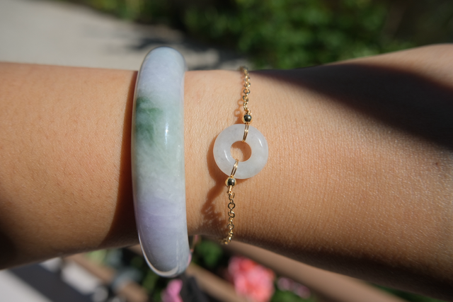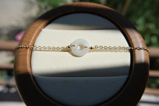 En son centre, un cercle de jade poli en forme de donut, symbole d’harmonie et d’éternité, capte la lumière avec douceur. La pierre blanche pure et lumineuse, est mise en valeur par une fine chaîne en plaqué or 14 carats, réglable de 15 cm à 19 cm pour s’adapter parfaitement au poignet.