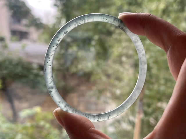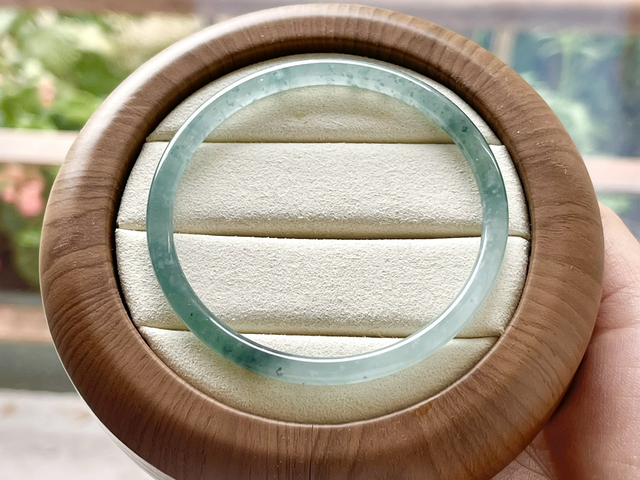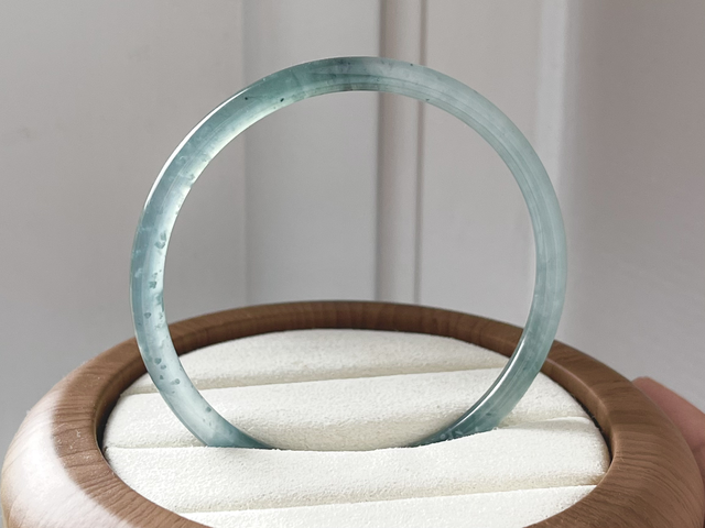Ce jonc fin et délicat en jade du Guatemala, d’un diamètre de 58,5 mm (convient aux poignets de 56 à 60 mm) et d’une largeur de 4,7 mm, se distingue par ses nuances bleutées translucides, rappelant la surface paisible d’un lac d’hiver figé sous la glace.